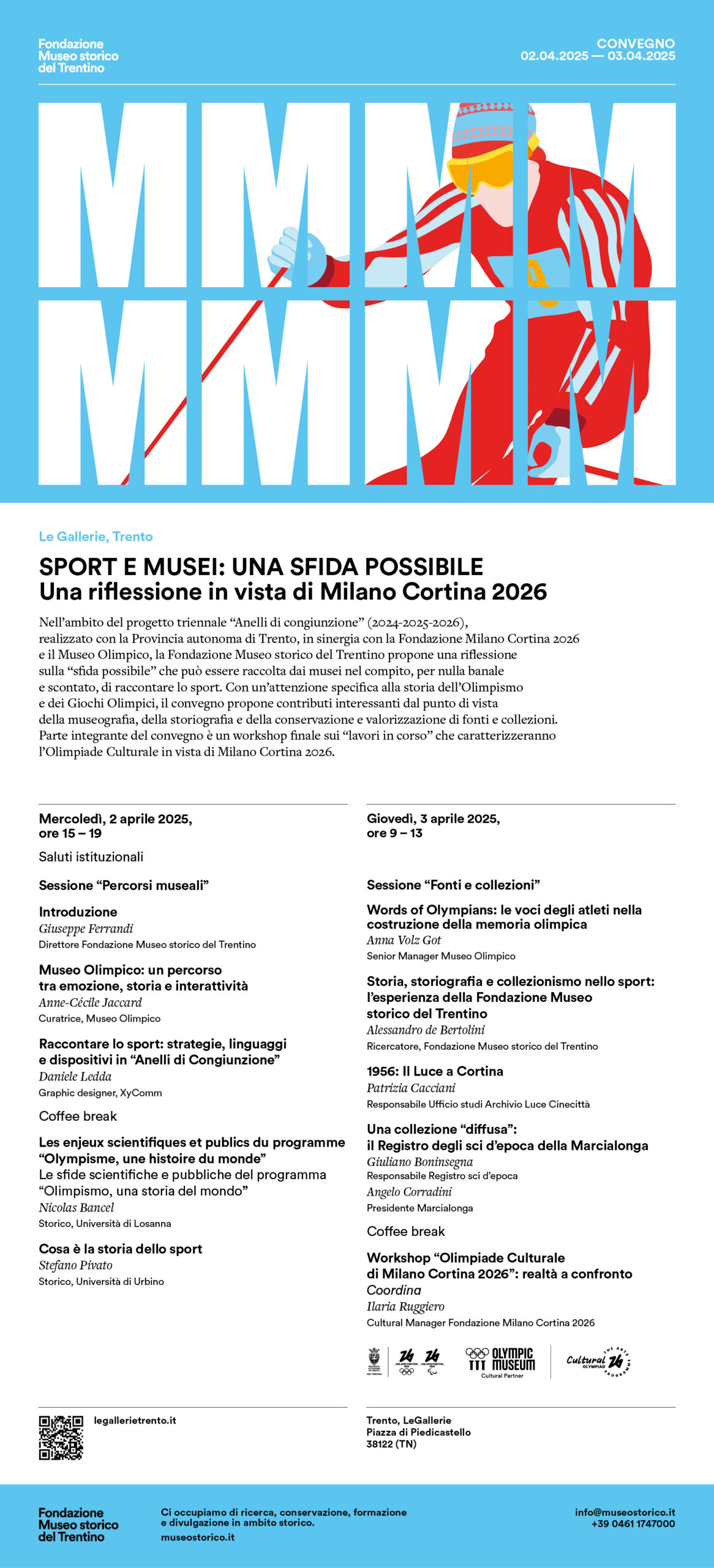 Nell’ambito del progetto triennale “Anelli di congiunzione” (2024-2025-2026), realizzato con la Provincia autonoma di Trento, in sinergia con la Fondazione Milano Cortina 2026 e il Museo Olimpico, la Fondazione Museo storico del Trentino propone, mercoledì 2 e giovedì 3 aprile, una riflessione sulla “sfida possibile” che può essere raccolta dai musei nel compito, per nulla banale e scontato, di raccontare lo sport. Con un’attenzione specifica alla storia dell’Olimpismo e dei Giochi Olimpici, il convegno propone contributi interessanti dal punto di vista della museografia, della storiografia e della conservazione e valorizzazione di fonti e collezioni.
